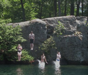 Once the wild rides quieted down, the dads started the cliff jumping escapades.  We started out small, in Paradise Bay.  Here a large rounded rock juts from the shore line into the water.  The kids would leap from the boats into the deep, calm water, warm on the surface for northern natives, but icy a few feet down, and swim to the rock.  The climb up was slippery, but only about as high as a flight of stairs.  It seemed safe enough.      Both families enjoyed many great afternoons filled with robin egg blue skies and puffy clouds, enough sun for warmth, but not too much to wilt, laughing kids and contented moms.  Apparently, contentment was not part of the dad’s game plan.
