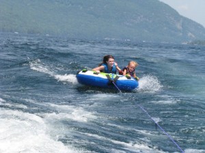 We found The Narrows of Lake George and the picnic islands.  These outcroppings of rock and trees became our summer home.   Often we would arrive early and settle in for the day.  This was fine when the kids were young.   As they became older and grew restless, tubing was discovered.  Going on a slow, smooth ride did not last long; soon wake chasing became a sport.  The rambunctious dads would spend hours on the water, pulling tubes around loaded down with kids; sometimes two to a tube, sometimes two tubes with kids jumping back and forth between them as the boat ran at a fast speed.  Often the chant would be heard “Mohican, Mohican” and encouraged, the dads would seek out the largest wake.  With their eyes squinted in search, the men resembled crazed sailors searching for shore after a long voyage.   Eventually, one of the dads would spot a cruiser and head for its wake.   As the tube vaulted over the huge waves the riders would soar into the air, be momentarily suspended then, with a crush, their faces would hit as rider and tube bounced back onto the water.  The moms put a stop to these wild rides when the kids climbed into the boat with huge smiles and bloody noses.